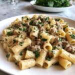 Keywords: ground beef pasta, cheesy pasta, quick dinner, ziti recipe, skillet pasta, weeknight meal