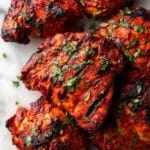 The image shows a close-up of grilled chicken pieces covered in a red sauce and sprinkled with green herbs. The chicken has a slightly charred texture with juicy, glistening skin, and the herbs add a fresh, leafy detail on top. The chicken pieces are grouped closely together on a white marbled surface, making the rich colors of the sauce and herbs stand out. The photo taken with an iphone --ar 4:5 --v 7