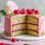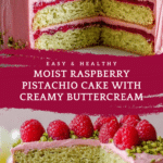 Keywords: Raspberry pistachio cake, pistachio cake recipe, raspberry buttercream, homemade raspberry jam, layered cake dessert