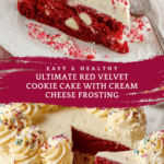 Keywords: Red Velvet, Cookie Cake, Dessert, White Chocolate, Cream Cheese Frosting, Party Cake, Red Velvet Cookie