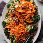 7. Assemble Salad: In a large bowl, combine kale, carrot ribbons, and chickpeas. Toss with some vinaigrette. Add roasted cabbage and squash, add more vinaigrette, and gently toss. Sprinkle almond crunch on top. Serve warm or at room temperature for best flavor.