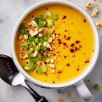 - Serve and garnish: Ladle the creamy roasted carrot soup into bowls. Garnish with optional toppings such as toasted cashews, fresh cilantro, chopped green onions, a squeeze of lime juice, or a sprinkle of cayenne pepper to add extra flavor and texture.