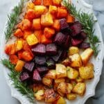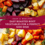 A delicious and healthy recipe for roasted root vegetables including carrots, parsnips, sweet potatoes, red onion, and beet, seasoned with fresh rosemary and thyme, then oven-roasted to perfection. This dish makes a flavorful and colorful side that’s perfect for any meal.