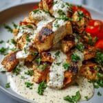 - Slice and Serve: Thinly slice the grilled chicken into strips. Arrange on a serving platter or in pita bread, drizzle generously with the creamy garlic sauce, and top with sliced cucumbers, tomatoes, and pickled onions. Serve warm.
