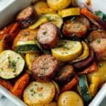 Keywords: sheet pan sausage recipe, roasted vegetables, one-pan meal, easy dinner, Italian sausage recipe, healthy sausage and veggies, quick weeknight dinner