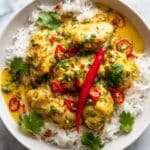 - Garnish and serve: Garnish with additional cilantro, sliced fresh chili or jalapeño, and toasted coconut flakes if desired. Serve hot over your choice of cooked rice, quinoa, or cauliflower rice for a complete meal.