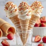 - Fill and Garnish the Cones: Fit a large piping bag with a wide tip and fill it with the cheesecake mixture. Pipe about ⅔ cup of filling into each hardened decorated waffle cone, shaping it to resemble ice cream. Top each cone with reserved strawberry crunch and a few diced fresh strawberries for garnish.