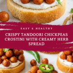 Store leftover tandoori chickpeas in an airtight container at room temperature for up to 2 days to maintain their crispiness. The herb spread can be refrigerated for up to 3 days. Assemble the crostini just before serving to keep the bread crisp. Reheat chickpeas briefly in the oven if needed to refresh their crunch.