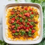 A square white dish holds a layered dip with a thick white creamy base layer covering the bottom. On top is a bright orange melted cheese layer spread evenly. The next layer has browned ground meat scattered all over, mixed with small bright green chopped peppers. The dip is topped with fresh red tomato pieces and vibrant green cilantro leaves distributed on the surface. The dish is placed on a white marbled texture with a green patterned cloth on the right side and some cilantro sprigs on the upper left corner. Photo taken with an iphone --ar 4:5 --v 7