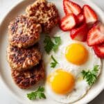 A white round plate sits on a white marbled surface, holding four golden-brown sausage patties stacked slightly overlapping on the left side, their texture crispy with dark grill marks. To the right, two sunny-side-up eggs with bright yellow yolks and white edges are garnished with fresh green parsley. In the top part of the plate, there are several sliced strawberries showing their red interior, along with two whole strawberries nearby. The colors are warm and inviting, with a mix of golden, white, red, and green. photo taken with an iphone --ar 4:5 --v 7
