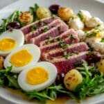 This Tuna Niçoise Salad is a vibrant and refreshing dish featuring seared ahi tuna steaks served tataki-style on a bed of marble potatoes, blanched green beans, cherry tomatoes, black olives, watercress, and parsley. Accented with boiled eggs and tangy caperberries, it’s finished with a zesty lemon and Dijon mustard dressing. Perfect for a light yet satisfying meal that combines fresh vegetables and tender tuna with Mediterranean flavors.
