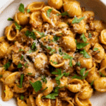 This Vegan Caramelized Onion Pasta features deeply caramelized onions blended with garlic, sun-dried tomatoes, and a creamy vegan sauce. Tossed with orecchiette pasta and fresh parsley, it’s a rich, flavorful plant-based dinner perfect for any weeknight.