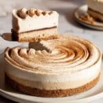 - Decorate the Cheesecake: Spread the icing over the frozen cheesecake with a spatula. For a decorative swirl effect, place the cake on a turntable and use a spoon to create swirls while spinning. Optionally, dust with extra cinnamon for garnish.