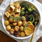 This Vegan Dijon Rosemary Sheet Pan Dinner is a simple, flavorful, and wholesome plant-based meal featuring marinated tofu, tender baby potatoes, and crisp broccoli all roasted together with a zesty Dijon rosemary vinaigrette. Perfect for an easy weeknight dinner, it combines bright lemon, fresh rosemary, and a touch of sweetness to create a delicious vegan dish that requires minimal cleanup and offers a balanced combination of protein and vegetables.