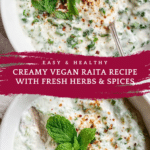 This refreshing Vegan Raita is a traditional Indian yogurt dip made with unsweetened nondairy yogurt, grated cucumber, fresh herbs, and warming spices. It’s a perfect dairy-free accompaniment to spicy dishes, offering coolness and flavor in just 15 minutes.