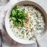 This refreshing Vegan Raita is a traditional Indian yogurt dip made with unsweetened nondairy yogurt, grated cucumber, fresh herbs, and warming spices. It’s a perfect dairy-free accompaniment to spicy dishes, offering coolness and flavor in just 15 minutes.