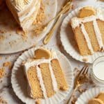 - Assemble first layer: Place one cake layer on a serving plate. Spread or pipe vanilla buttercream evenly on top using an offset spatula or palette knife.